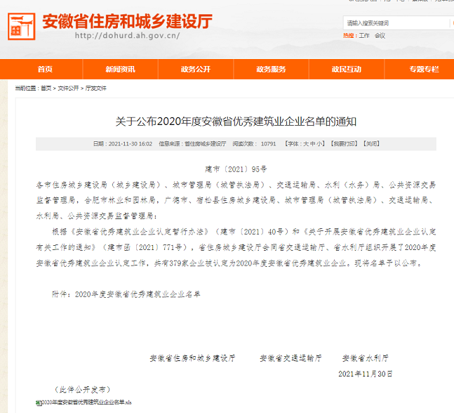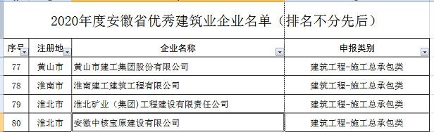 近日,安徽省住建廳傳來喜訊,2021年度安徽省優(yōu)秀建筑業(yè)企業(yè)評(píng)選結(jié)果已出爐,黃山市建工集團(tuán)榮獲2020年度安徽省優(yōu)秀建筑業(yè)企業(yè)---建筑工程施工總承包類優(yōu)秀建筑業(yè)企業(yè)。
