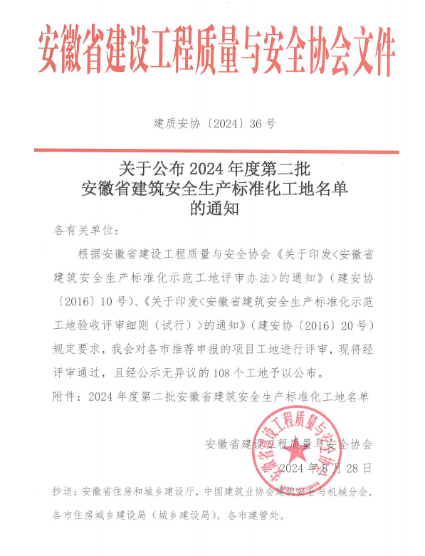 近日,安徽省建設(shè)工程質(zhì)量與安全協(xié)會公布2024年度第二批安徽省建筑安全生產(chǎn)標(biāo)準(zhǔn)化工地名單,由黃山建工集團承建的國網(wǎng)安徽黃山供電公司運維檢修及信息通信用房項目光榮上榜。