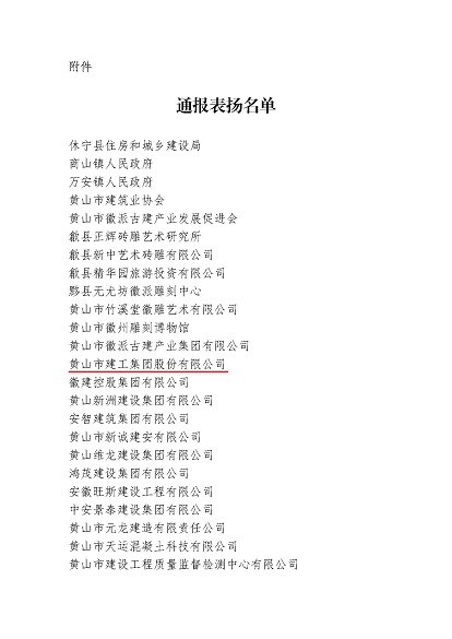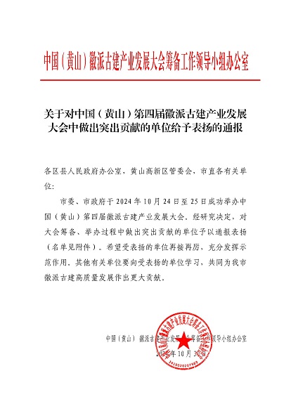 市委、市政府于2024年10月24日至25日成功舉辦中國(黃山)第四屆徽派古建產(chǎn)業(yè)發(fā)展大會(huì)。近日,中國(黃山)徽派古建產(chǎn)業(yè)發(fā)展大會(huì)籌備工作領(lǐng)導(dǎo)小組辦公室發(fā)布《關(guān)于對(duì)中國(黃山)第四屆徽派古建產(chǎn)業(yè)發(fā)展大會(huì)中做出突出貢獻(xiàn)的單位給予表揚(yáng)的通報(bào)》,黃山建工集團(tuán)榮列其中。